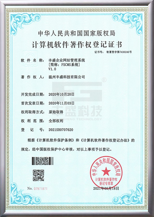 3、“豐盛企業(yè)網(wǎng)站管理系統(tǒng)V1.0”(簡稱:FSCMS系統(tǒng))的法定著作權(quán)人,并于2021年05月18日被正式授予《中華人民共和國**版權(quán)局計算機軟件著作權(quán)登記證書》,登記號為2021SR0707620。